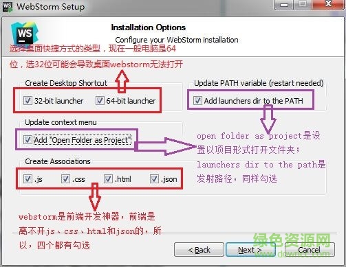 3.配置webstorm安装项,注意看图中的文字介绍,不要直接下一步了,不然功能缺失又要重新来过的。