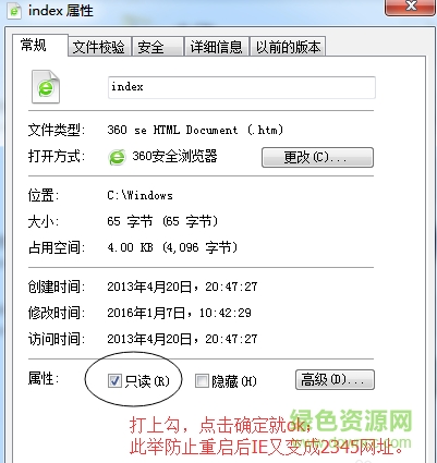 第六步:如图,打开index属性对话框后,在“只读”前打上勾,单击“确定”就ok了,杜绝2345网址死灰复燃。