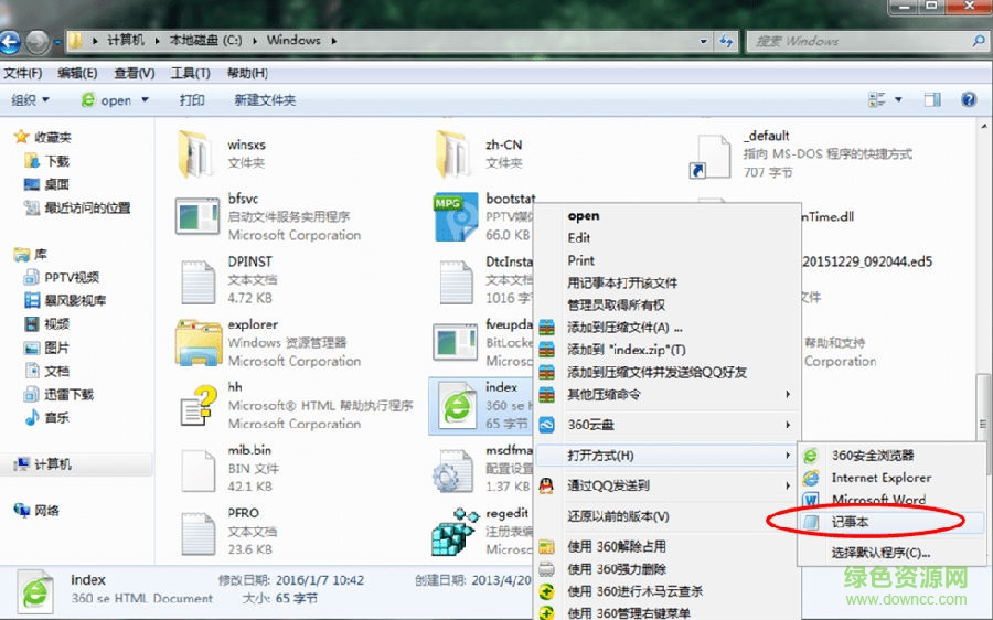 第二步:如图,对着index图标单击鼠标右键,选择“打开方式”-“记事本”。这样才能看到里面的内容。