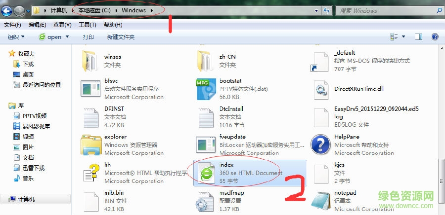 第一步:如图,打开C盘下面的Windows文件夹,找到一个名叫index的网页图标。 (注:只要找到叫index的就行,就它一个。有些电脑可能显示index.htm)