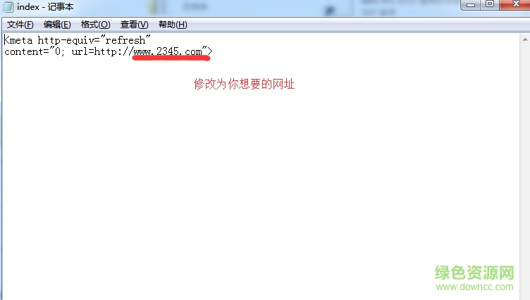 第三步:如图,打开index文件以后,你会看到这个可恶的2345网址,把它替换成你想要的网址即可。(注:仅换网址,不要删掉其他符号哦!)