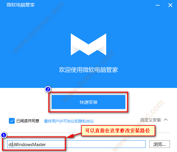 2、点击上图中的“自定义安装”之后,会显示下图内容。直接在①中修改安装路径,确认无误之后点击“快速安装”