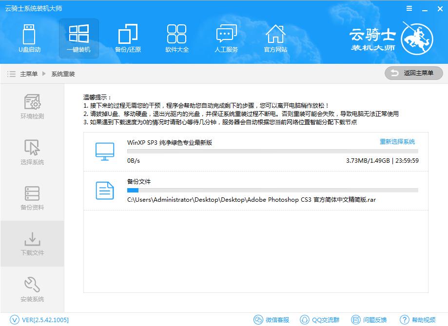 进入“下载文件”,云骑士在为用户提供全新系统下载的同时对文件进行备份,等待完成即可。如左图所示: