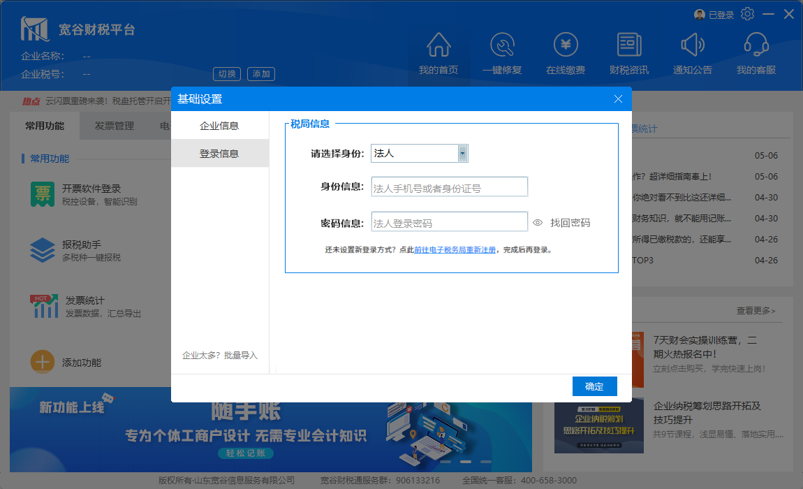 4、点击主页面“添加”按钮,进行企业“添加”,信息输入完成后点击“下一步”-“确定”