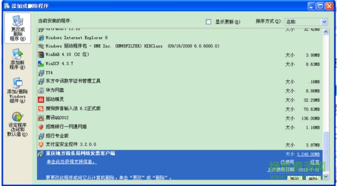 卸载网络发票客户端方式。在“控制面板”中“添加/删除程序”里面找到“重庆市地方税务局网络发票客户端”点击“删除”