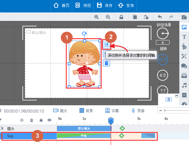 1. 单击选中需要添加手绘动画效果的物体, 之后单击物体侧边栏的“滚动到并选择该对象的时间轴”定位到该物体的时间轴。