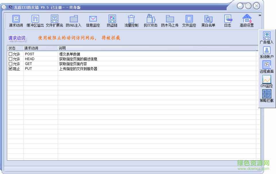 龙盾iis防火墙是一款专门针对IIS的安全防护软件,龙盾IIS防火墙采用高效、安全的系统接口(IsapI),对于各种流行的Web入侵,均具有显著的防御效果。需要的朋友欢迎来绿色资源网下载官方最新版!