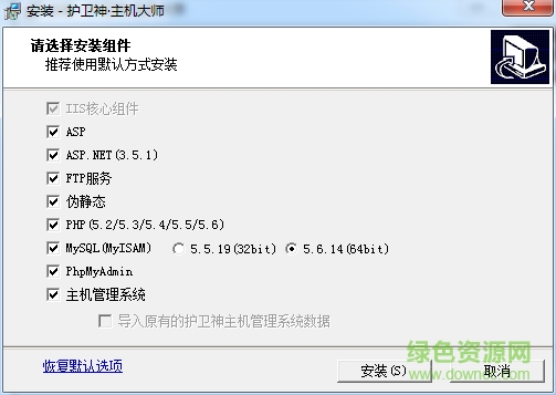 8.一键安装内容:IIS+ASP+ASP.net+PHP(5.2~5.6)+MySQL+FTP+PHPMyAdmin+伪静态+主机系统