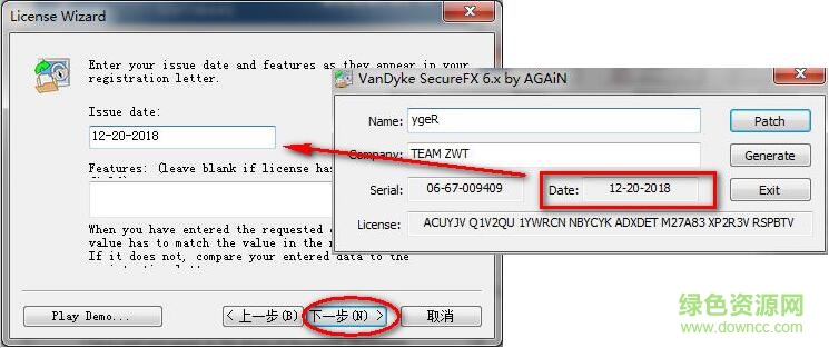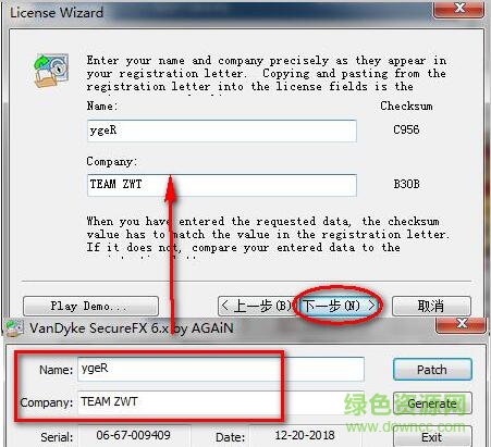 5.然后回到SecureFX(第2步的位置,不要关闭注册机),将注册机中的ygeR填入(如图),点击“下一步”