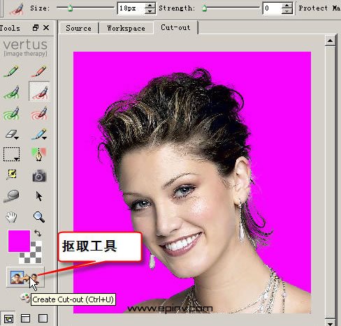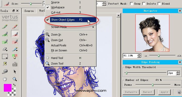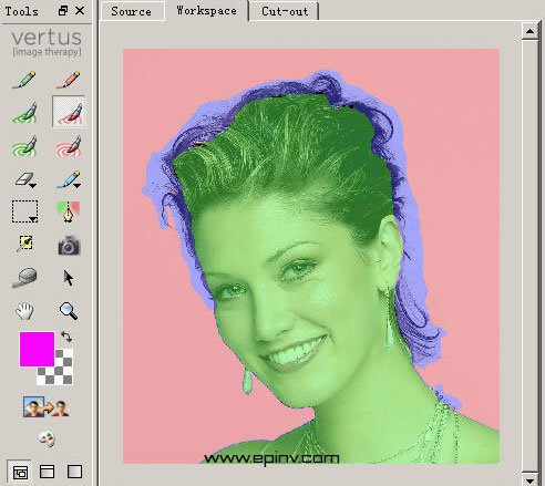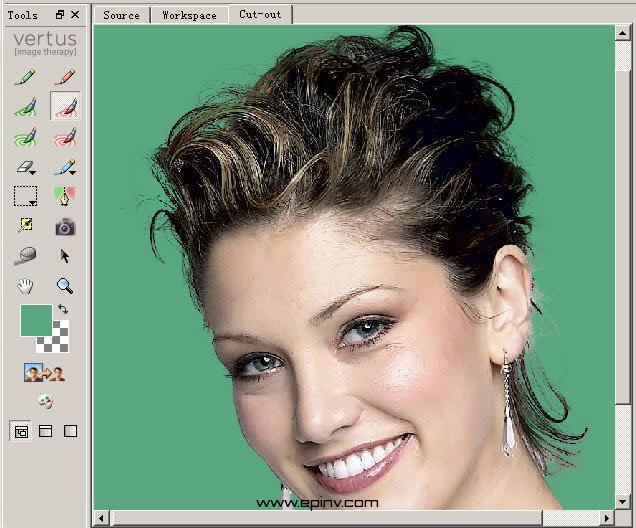 1、我们在Fluid Mask 3中打开一幅图像。今天我们来学习抠取头发。请注意工具栏中每个工具的用法。这是学习的关键,即使你对英语不是很明白也没关系,知道每个工具是干什么的,经过简单学习你也会使用这个软件的。