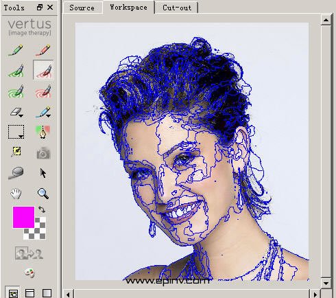 2、在Fluid Mask 3打开图像后,它会按照图像的色彩和明暗,自动进行分析,然后把图像用蓝色线条划分为若干区域。我们可以根据需要,单独对每个区域进行删除或保留,这是这个软件的精华,这对抠取注册复杂的图像注册有用。