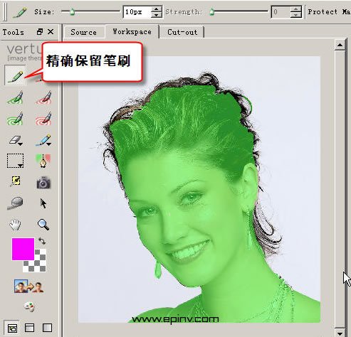 3、对于简单图像的抠取,Fluid Mask 3一般是先用局部去除笔刷划出背景。但今天我们要抠取的重点是头发,为防止头发被无意去掉,所以抠取头发我们先用“局部保留笔刷”划出我们要保留的大致区域。如图绿色部分是要保留的区域。