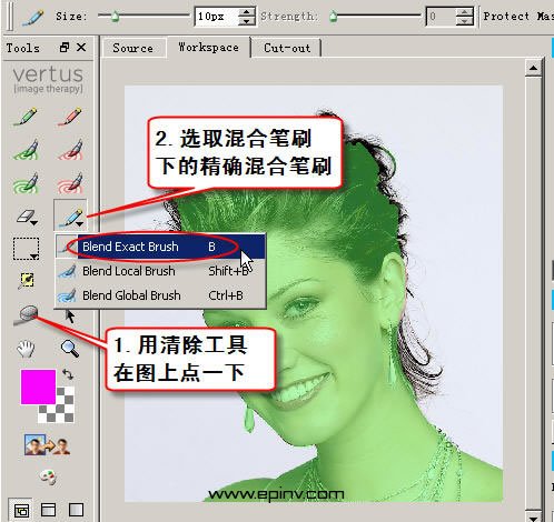 7、接下来,我们选取混合笔刷的第一个“精确混合笔刷”(Blend Exact Brush)调整至合适大小,在头发边沿处涂抹。它的作用是使该区域呈半透明状态。