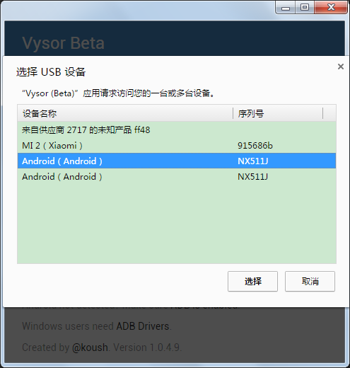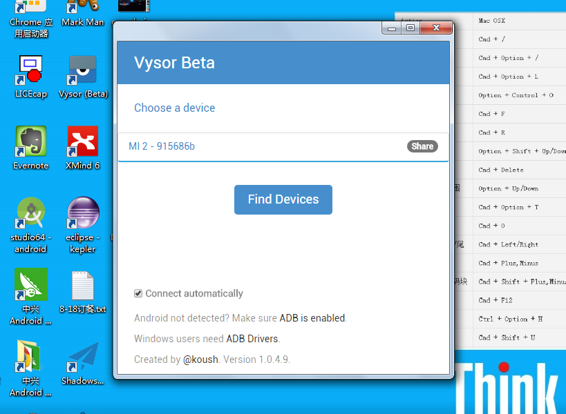 装完插件,点启动应用,Vysor 就出来啦,瞅瞅它的小模样,不同平台可能会不一样(win和mac一个屌样,已连过小米2s的图)。