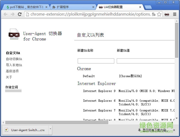 user agent switcher for chrome是一款专为谷歌浏览器准备的浏览器插件,它能够帮助谷歌浏览器伪装成不同的浏览器,方便用户更好的去测试初始网页,有需要的朋友可以来绿色资源网下载使用!