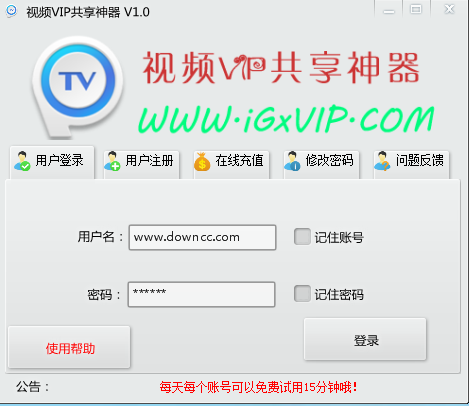 视频VIP共享神器是一款视频网站vip账号分享工具,软件集合了各大视频平台的VIP会员帐号。通过此软件可获取爱奇艺、迅雷、优酷、腾讯好莱坞、乐视五大主流视频网站的VIP会员账号以及密码,并且实时更新,可以选择获取最新的账号资源,从而可以免费体验视频会员的待遇,观看会员独享的视频资源。喜欢的用户可下载体验!