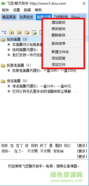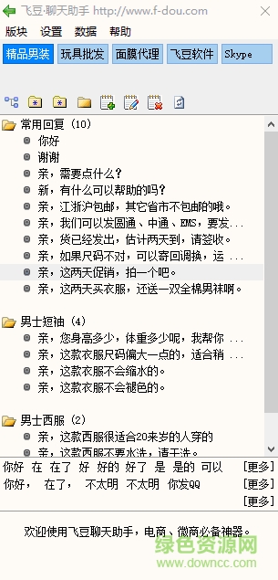 飞豆聊天助手是一款免费微商聊天工具,支持qq、微信、阿里旺旺、京东、yy等多种聊天工具,帮助你快速回复客户信息,更好的提供咨询服务,来绿色资源网试试吧!