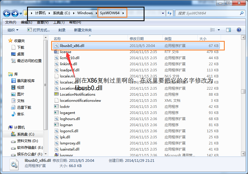 这段话的意思是说,如果系统是64的,你需要去x86 的文件夹,复制libusb0_x86.dll 去c:Windowssyswow64 (说明:32位系统,请将文件复制去Windowssystem32), 然后把复制过去的libusb0_x86.dll 的名称换为libusb0.dll