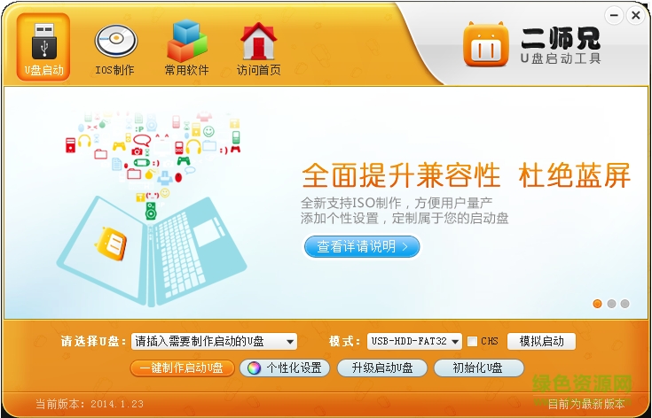 二师兄u盘启动盘制作工具是一款十分实用的U盘制作软件,操作便捷,安全防护功能强大,支持一键备份与恢复,欢迎大家在绿色资源网下载使用!