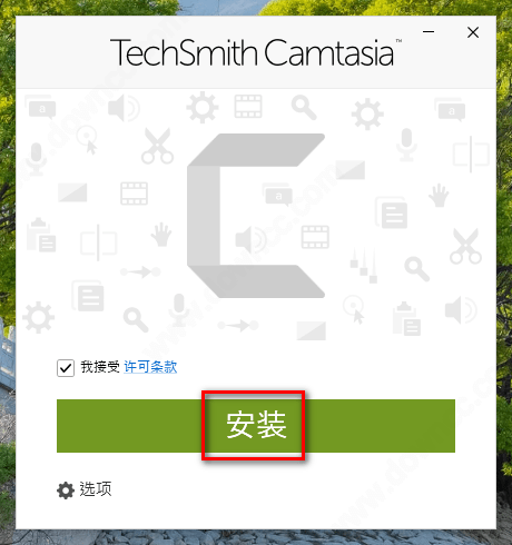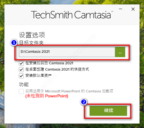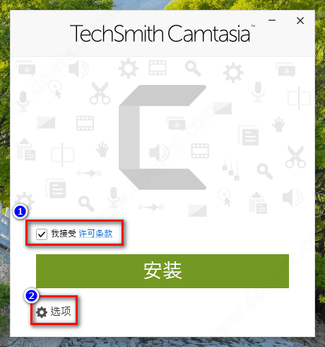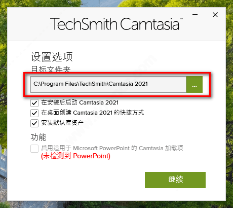 1、在绿色资源网下载techsmith camtasia2021,双击下载之后的文件“camtasia.exe”,软件会根据操作系统的语言自动设置,点击“确定”开始安装。