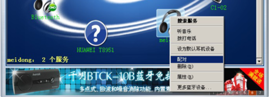 右键点击meidong,出现配对及搜索服务等栏, 点击配对时若需密码,则默认密码为:0000