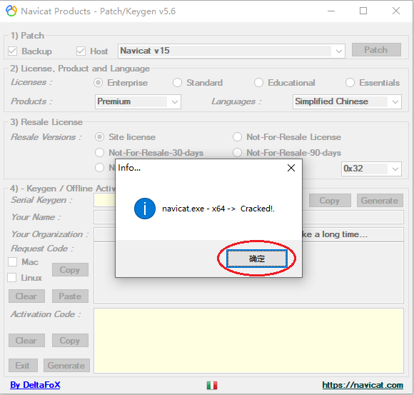 过一会就会有个navicat.exe - x64 - Cracked!.的弹窗,点击“确定”