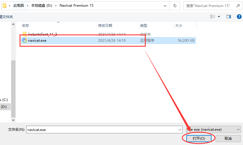 然后找到navicat premium15安装路径下的navicat.exe,选择并点击右下角的打开