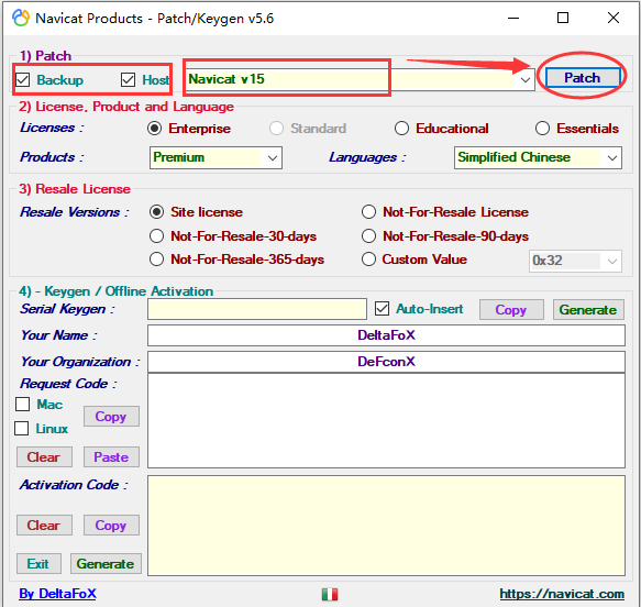 4.注册机打开后,Patch勾选Backup、Host,选择Navicat v15,然后点击Patch按钮