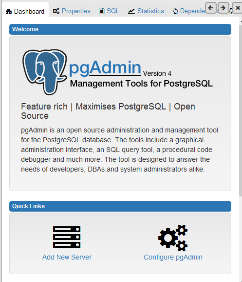 首先运行pgAdmin4,进入如下的软件界面,此时默认的界面语言为英文。