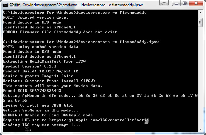 5、输入“idevicerestore.exe空格-e空格fistmedaddy.ipsw”(注意空格),然后回车。