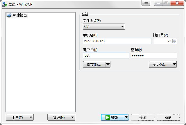 3、用户名root,密码alpine,文件协议SCP,点击登录。