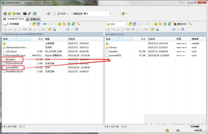 3、输入./kloader pwnediBSS,点击执行,此时iphone黑屏,关闭WinSCP。(这时候显示错误,直接关掉)。