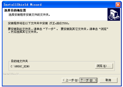 2) 选择安装程序所在文件夹,单击“下一步”。建议您不要把汉王e拍仪T550 软件安装到系统盘 C盘,您可以点击“浏览”选择相应路径,如d:HWDOC_KING。