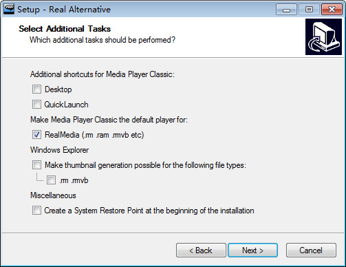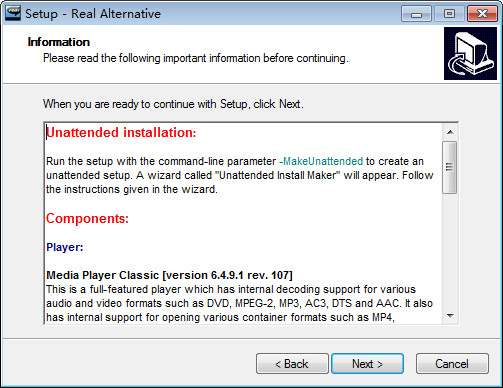 Real Alternative是从Realone中Rip出来的解码包,简而言之,通过安装这个解码包,你可以在不安装Realone或者realplayer的情况下播放Real格式的音频、视频文件。目前Media Player、Media Player Classic、Zoomplayer等主流的媒体播放器,都能够通过Real Alternative来播放Real文件。另外,Real Alternative也支持嵌入Web的Realmedia的播放。