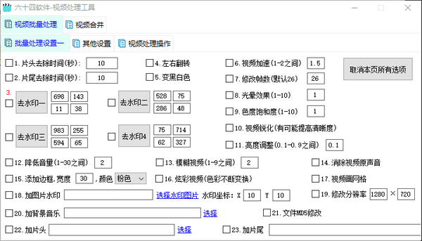 六十四视频处理工具是一款基于ffmpeg制作非常出色的视频处理软件,它具备了超实用的视频处理功能,一共有20多项功能,让你可以更好的处理视频,高效快速的完成自己的工作内容。