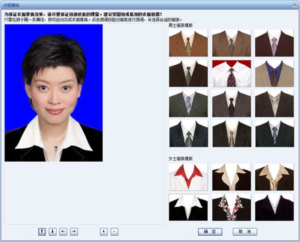 5.替换服装。点击“细节调整”,选择“证照服装替换”,在对话框中选择一款服装,在脖子处画一条线,自动替换服装,然后仔细调整好位置。