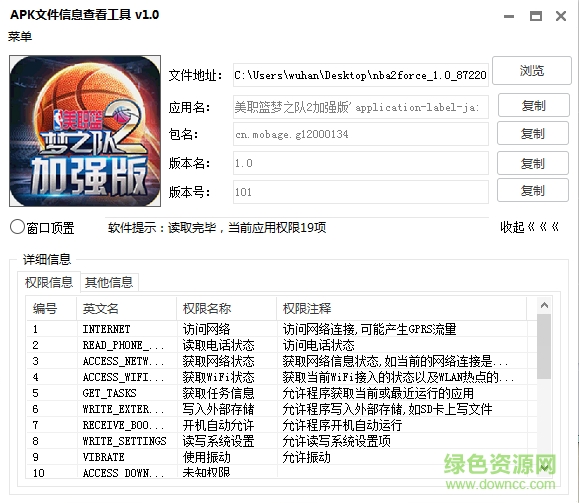 APK文件信息查看工具是一款可以快速查看APK包信息的工具,包括文件地址、应用名、包名、版本号、图片、权限信息等,让大家可快速获取自己需要的内容,绿色资源网诚意推荐!