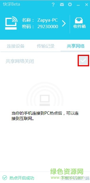 启动“快牙电脑版”后,如果电脑已连接互联网,则“快牙电脑版”将自动分享WiFi信号,供其他设备连接上网,此功能也可手动关闭网络共享。