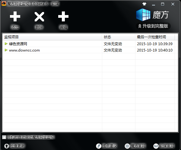 魔方网址监控软件是一款网站监控工具,该软件可以向用户第一时间提供目标网站的软件更新更新情况以及版本更新情况,软件界面简洁,操作简单,使用方便,可同时添加多个网址监测,有需要的朋友快来下载吧!