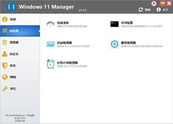 windows11 Manager优化管家软件拥有优化我们电脑系统的功能,就像是一个安全杀毒软件一样,不仅是拥有杀毒的功能,还拥有优化我们系统、提供清理打扫、调整系统BUG、保证信息安全、优化我们电脑网络等一系列的专业功能。