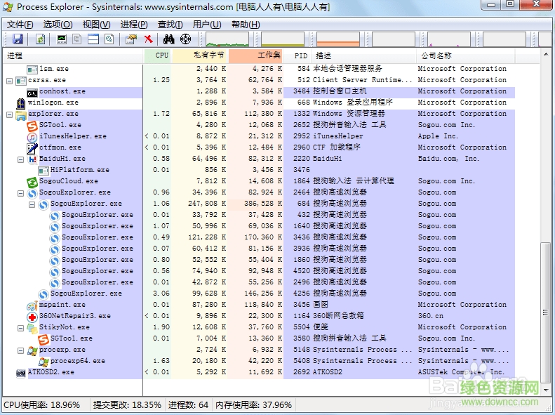 1.打开Process Explorer软件,可以看到电脑运行的所有的程序了,还可以看到电脑内存和CPU的使用情况。