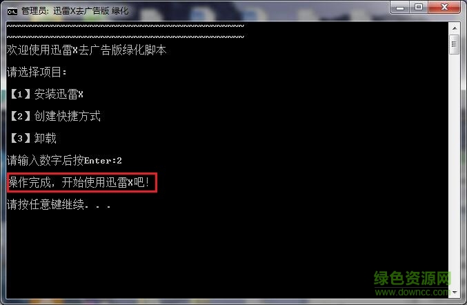 3.输入数字“2”,按“enter”,等待提示“操作完成,开始使用迅雷x吧!”,桌面就会生成迅雷的快捷方式,就可以开始使用了