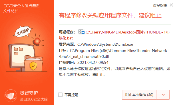 2.等待一会,过程中360安全卫士等杀毒软件会提示“有程序修改关键应用程序文件,建议阻止”,选择“允许程序所有操作”,并勾选不再提示