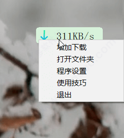 (2)其窗口是一个下载速度显示悬浮小控件,用于实时查看当前的下载速度和对下载器进行简单的设置(右键单击可以弹出菜单),比如下载/上传限速,开机自启,下载完成自动关机、BT trackers设置等等