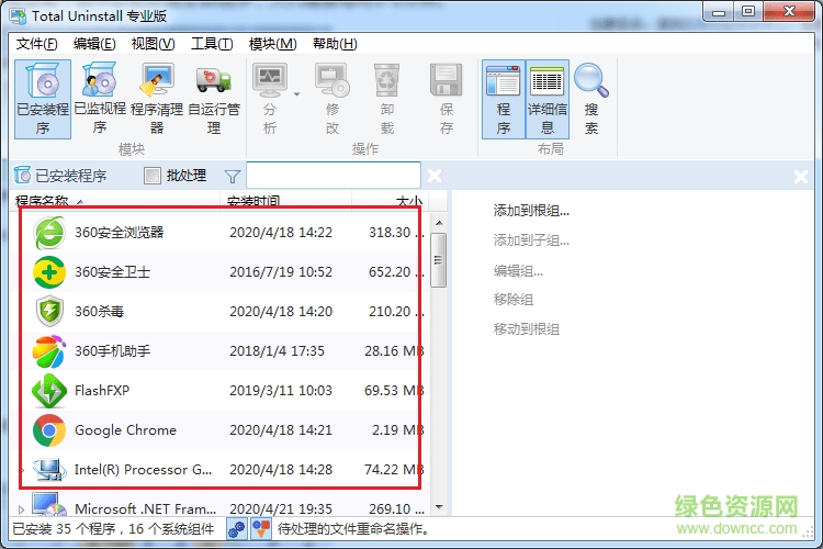 1.打开total uninstall后,会显示正在处理安装程序(自动识别电脑中的已安装的软件),大约需要等待1-2分钟,然后电脑中的安装程序会显示在左边框中。