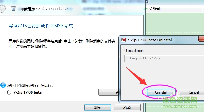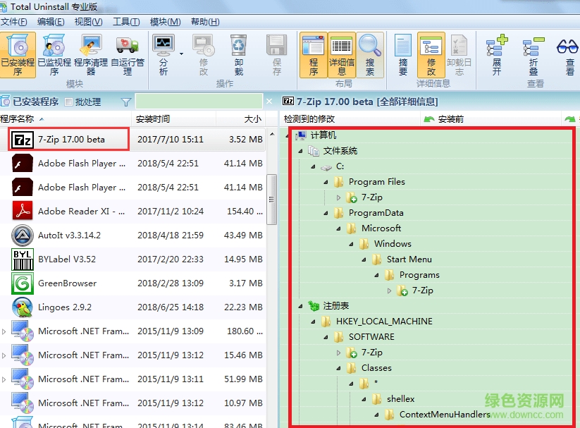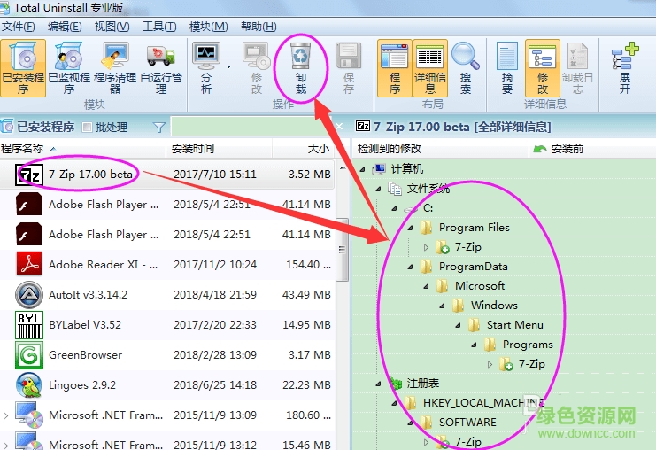 3.确定右侧所有7-zip文件夹和注册表大致是对的,开始卸载7-zip,点击菜单头部的卸载按钮。