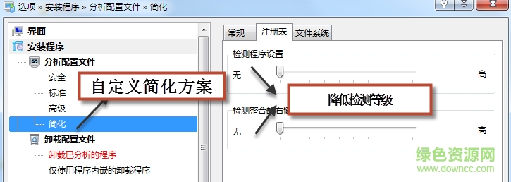 自定义配置是一种参数模板,可以额外创建用户的配置。比如默认的配置都需要严格检测安装文件位置,拖慢分析速度。如图所示,可以创建额外的“简化”配置,降低文件检测等级。不重要的软件卸载时,可以利用“简化”配置,用精确换速度,提升分析效率。