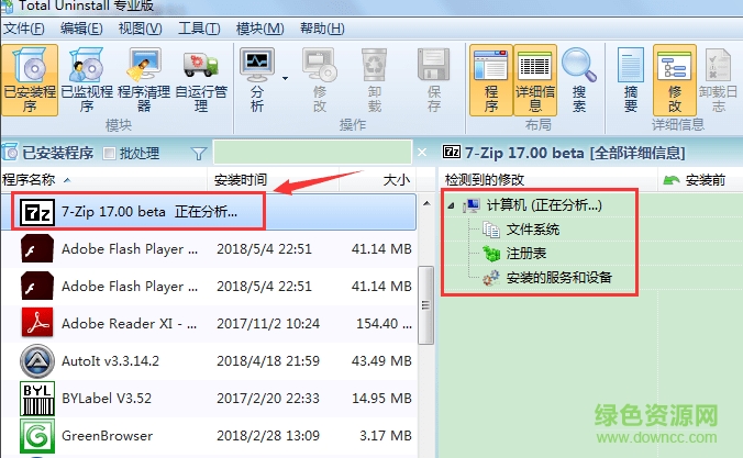 2.这里小编随便拿一个软件卸载做测试,点击左边的7-zip,会出现正在分析,等待一会,右边就会出现相关的安装文件和注册表等信息。