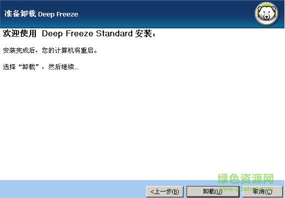 3. 确定冰点还原禁用后,运行冰点还原的安装程序,这时安装程序就会自动检测电脑里是否安装冰点还原,并给出卸载向导界面。
