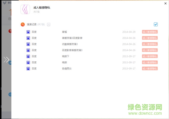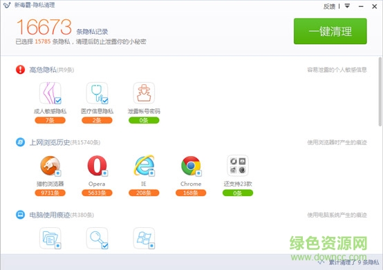 1.支持精准清理。比如用户只选择“高危隐私”中的“成人敏感隐私”,就可以只清理成人相关的网站访问、搜索及下载记录等,而不会将所有上网痕迹都清除。